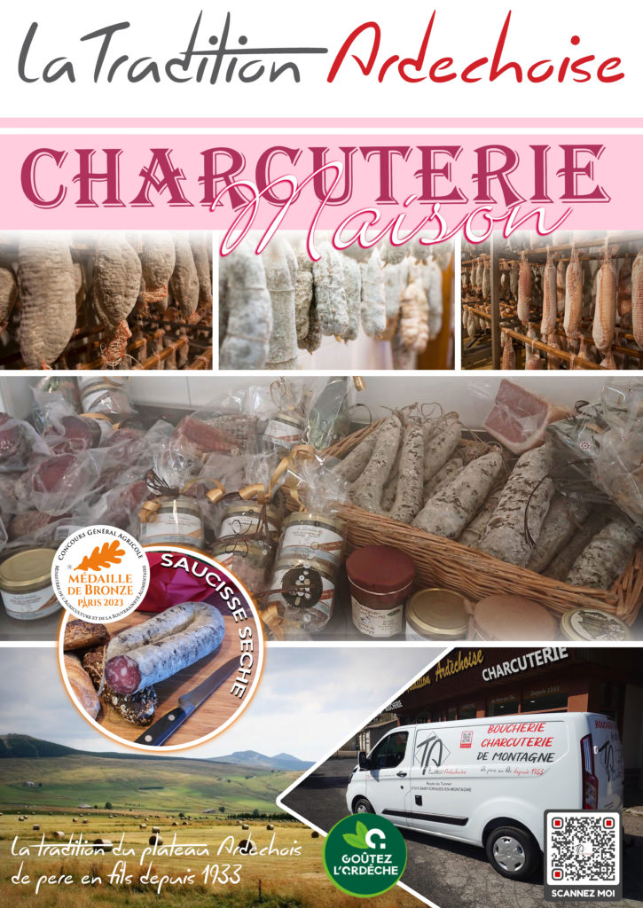 Boucherie-charcuterie fondée en 2017 par Anthony Teyssier, La Tradition Ardéchoise perpétue un savoir-faire familial transmis depuis quatre générations. L’entreprise privilégie la viande locale, s’appuie sur des éleveurs ardéchois et élabore saucissons, charcuteries et terrines dans le respect des traditions de la montagne ardéchoise.